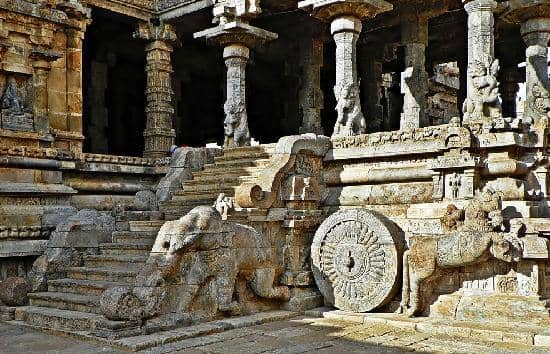 A generation later at Darasuram, the entire entrance mandapa becomes a chariot pulled by horses, its balustrades carved with royal elephants welcoming every visitor at every step.